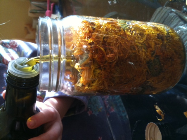 (Calendula oil is made by steeping calendula flower petals in olive or almond oil for 6 weeks, then straining out the plant material and reserving the infused oil. We used organic olive oil to steep ours.)